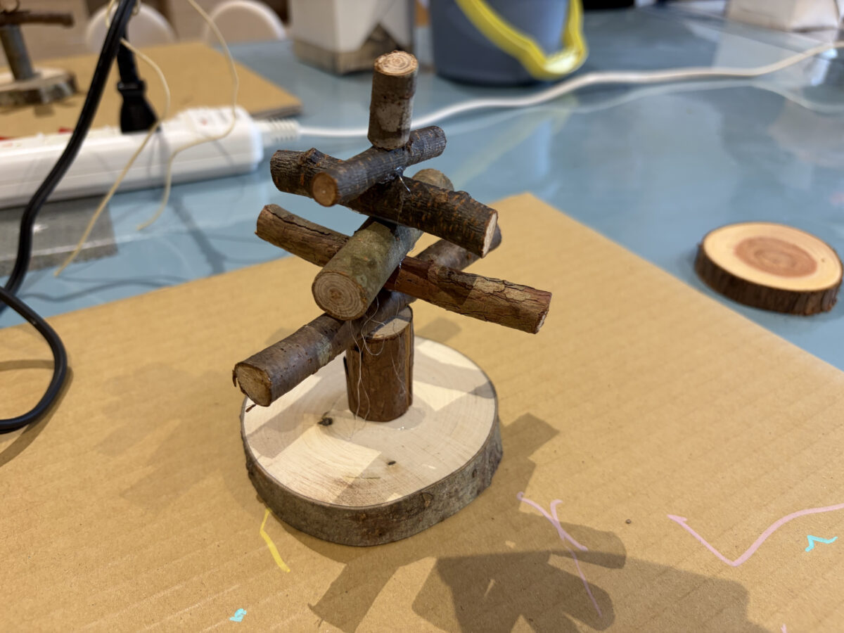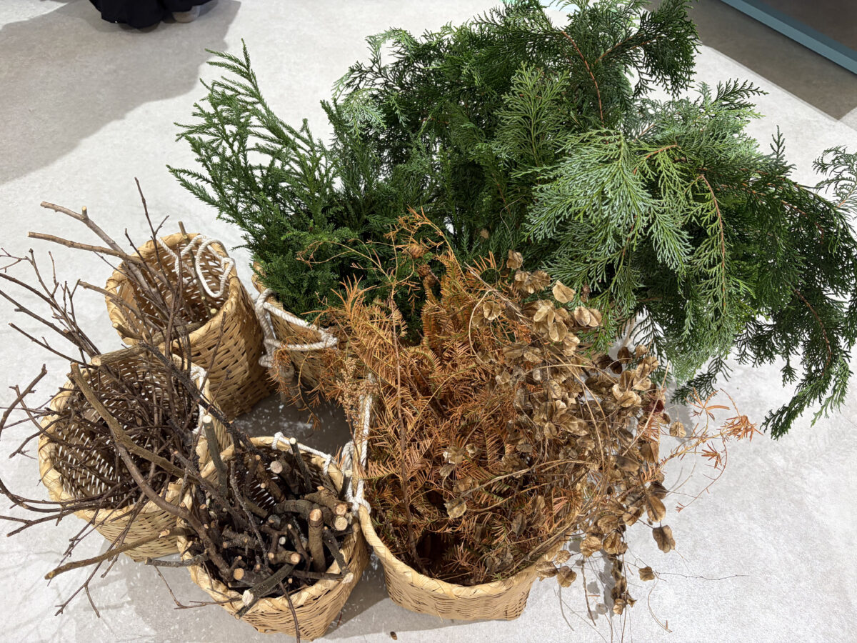 長さの違う木の枝を組み合わせ、ツリーをつくっていきます。